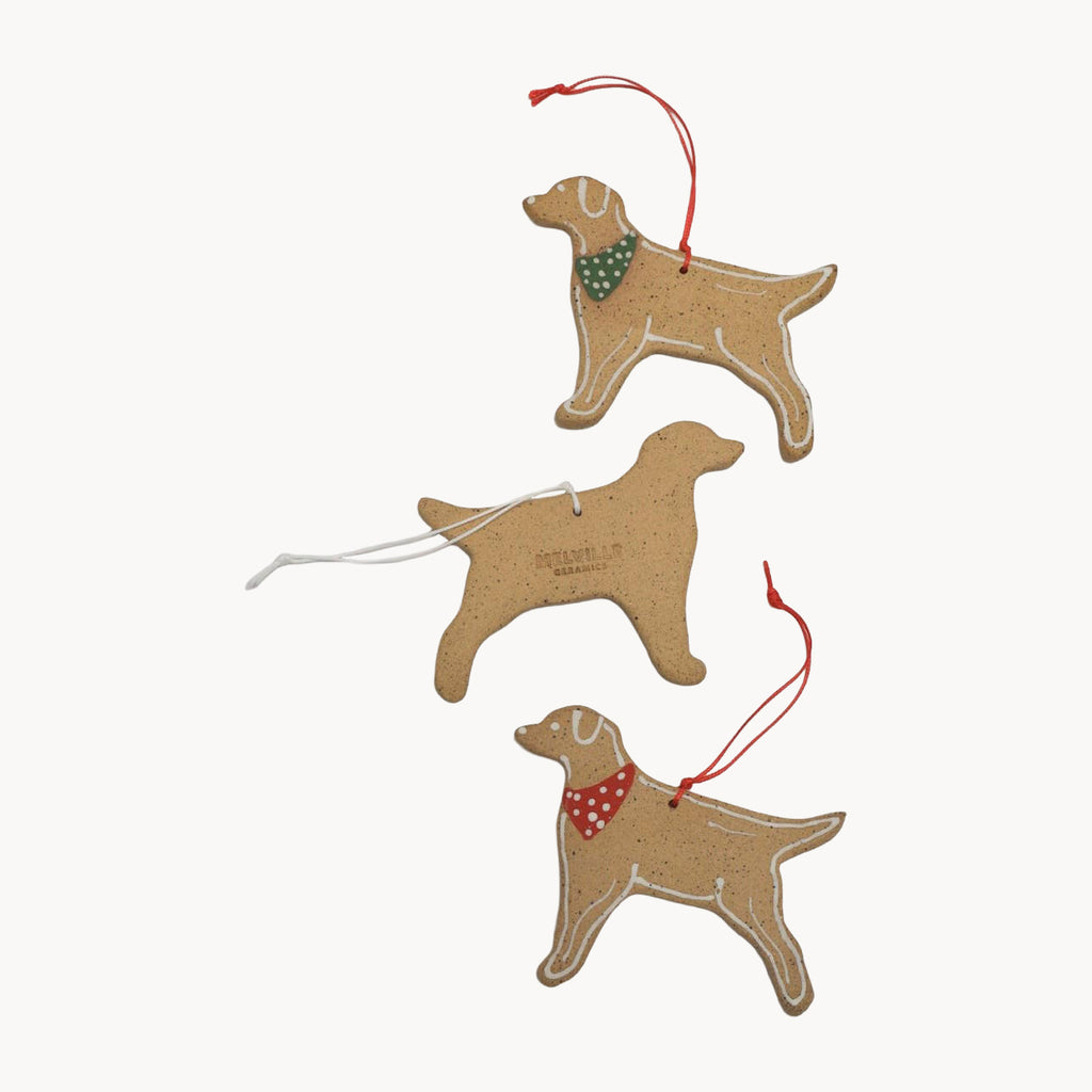 Handmade ceramic Labrador ornament with hand-painted details in colorful underglaze. Each ornament is hand-stamped with the Melville Ceramics logo on the back and strung with a durable nylon chord. These beautiful one of a kind ornaments make for lovely gifts during the holiday season.