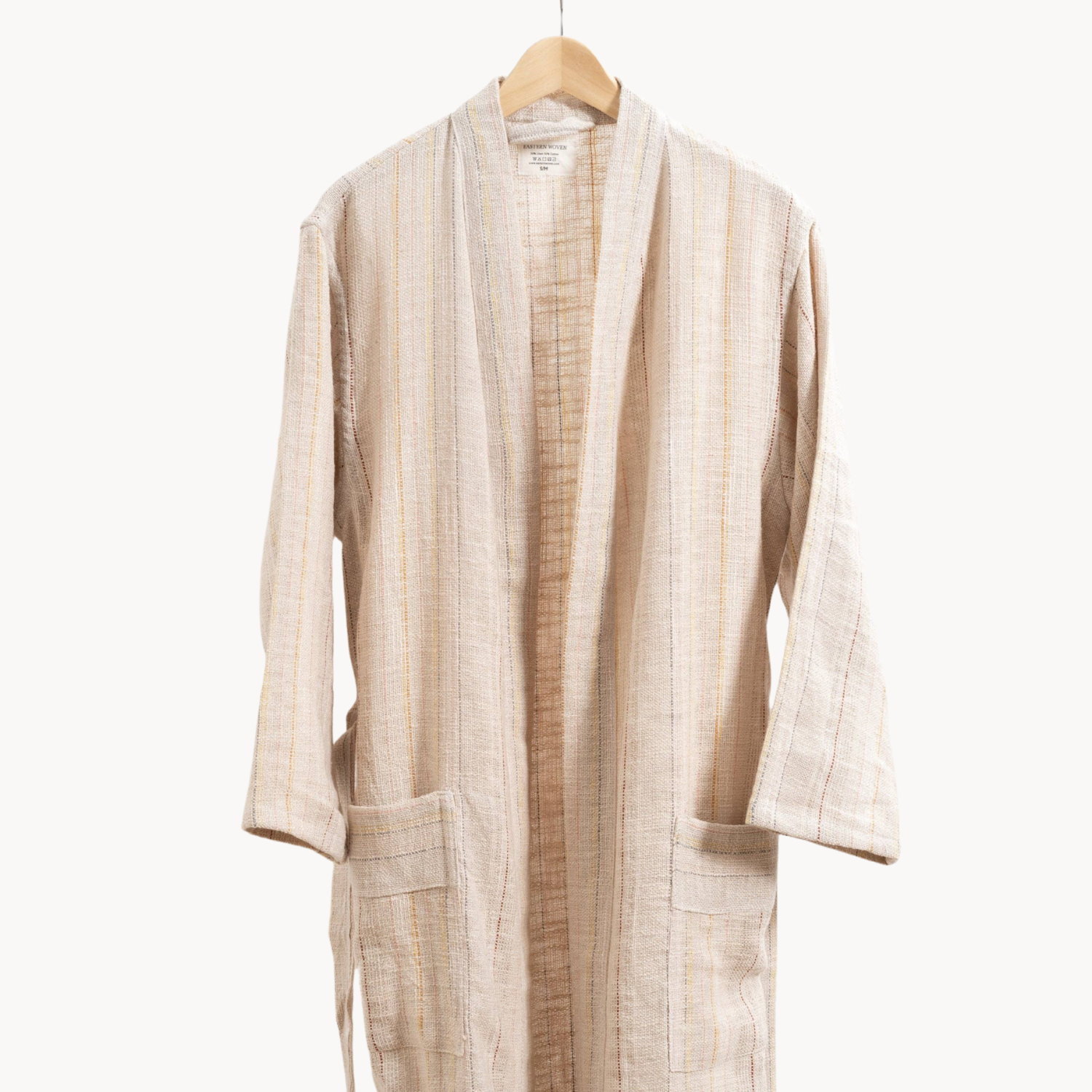 The Kirlangic Robe is made from soft and breathable linen-cotton blend and exudes a relaxed and effortless vibe. With a classic beige color, it's versatile enough to match any look. Perfect for lounging at home or throwing over your swimsuit on the beach, this robe is designed to be a staple in your wardrobe. Available in multiple sizes to fit your body perfectly.