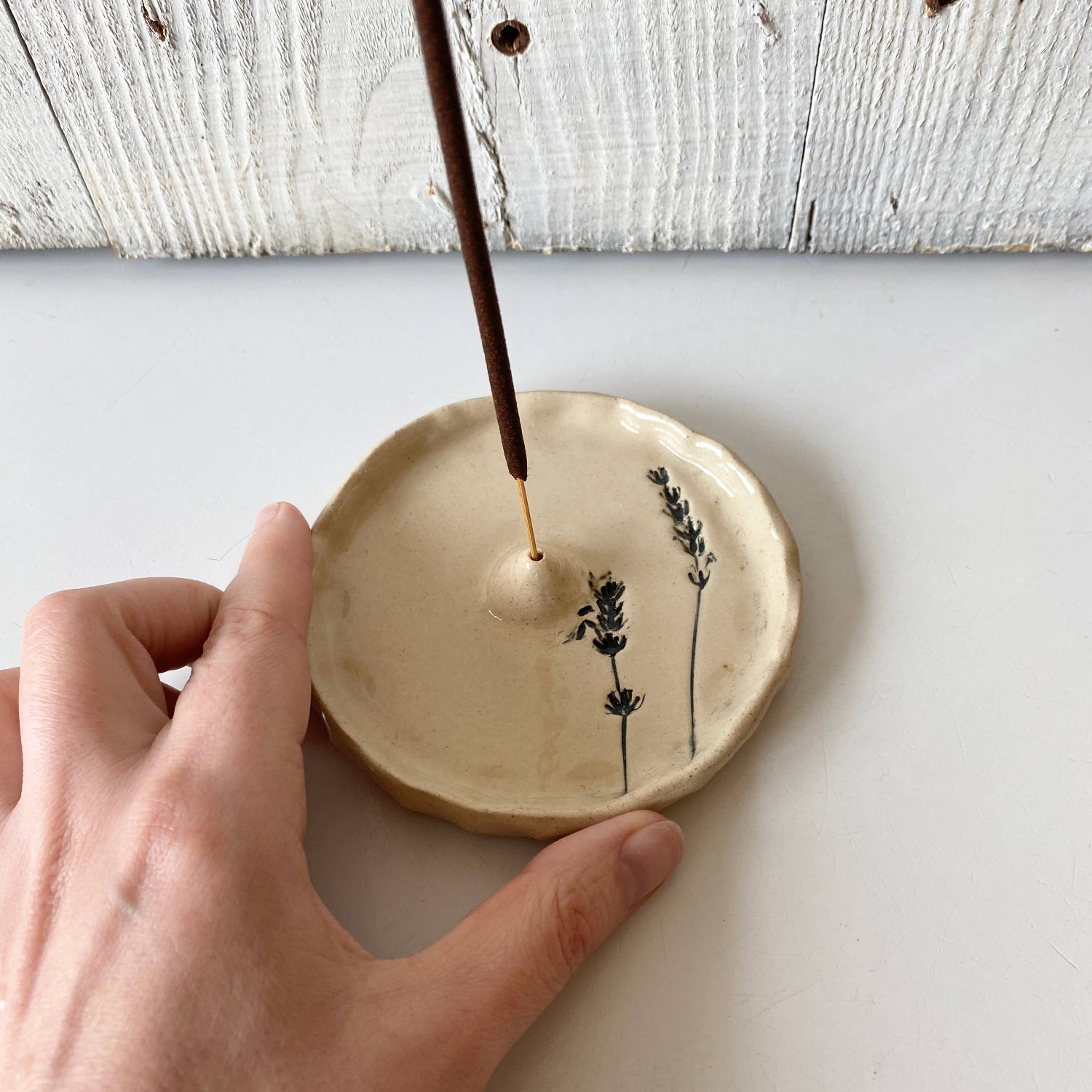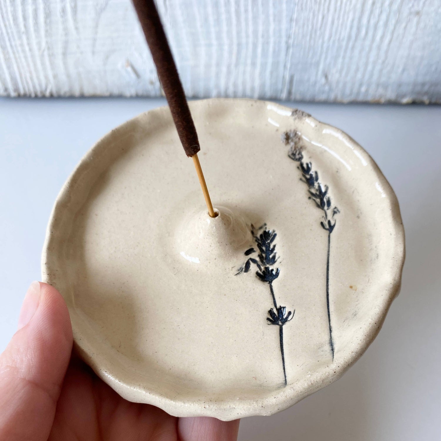 These beautiful, handmade lavender imprinted incense holders are perfect to place your favorite incense—each piece is handcrafted from white stoneware clay, utilizing textured slabs to create its unique form. Natural botanicals are rolled right into the wet clay and leave a lovely imprint.