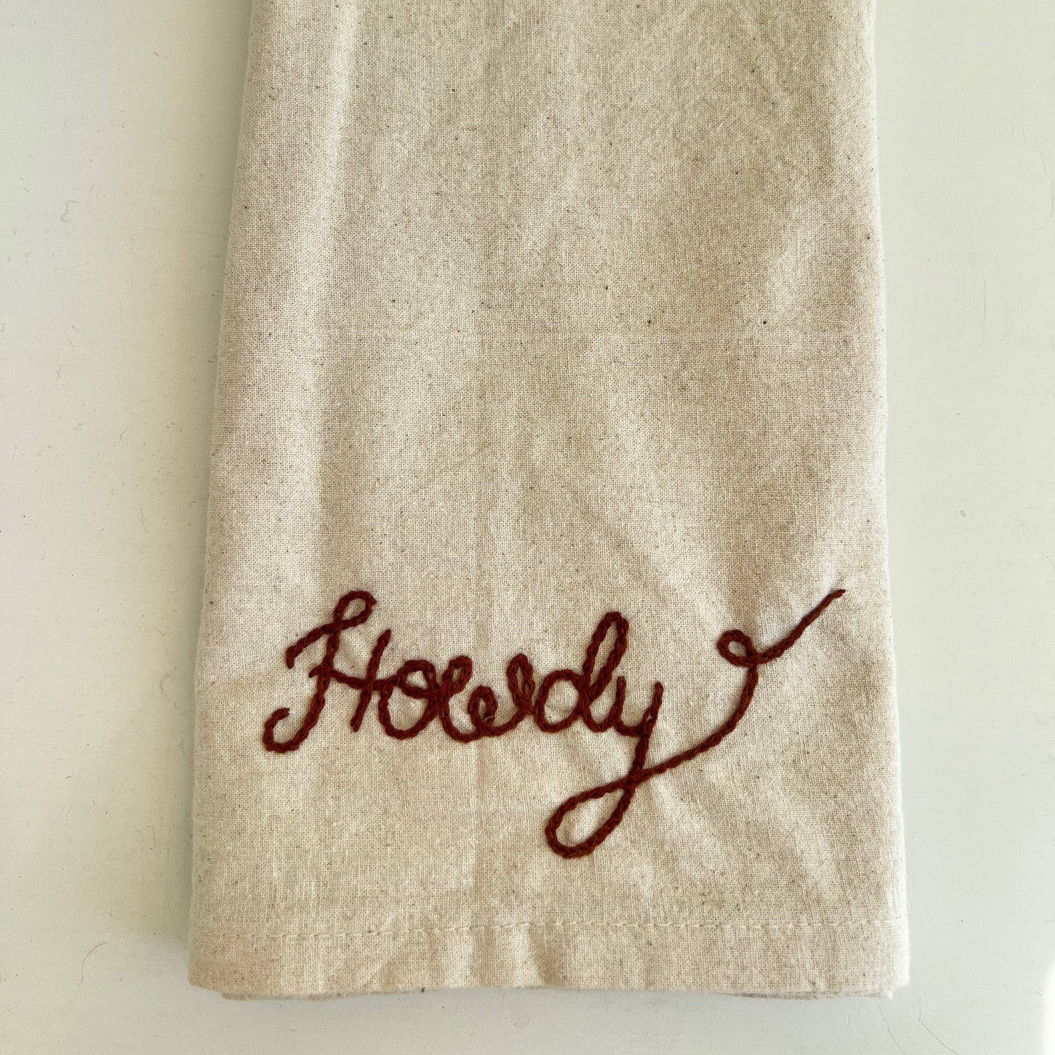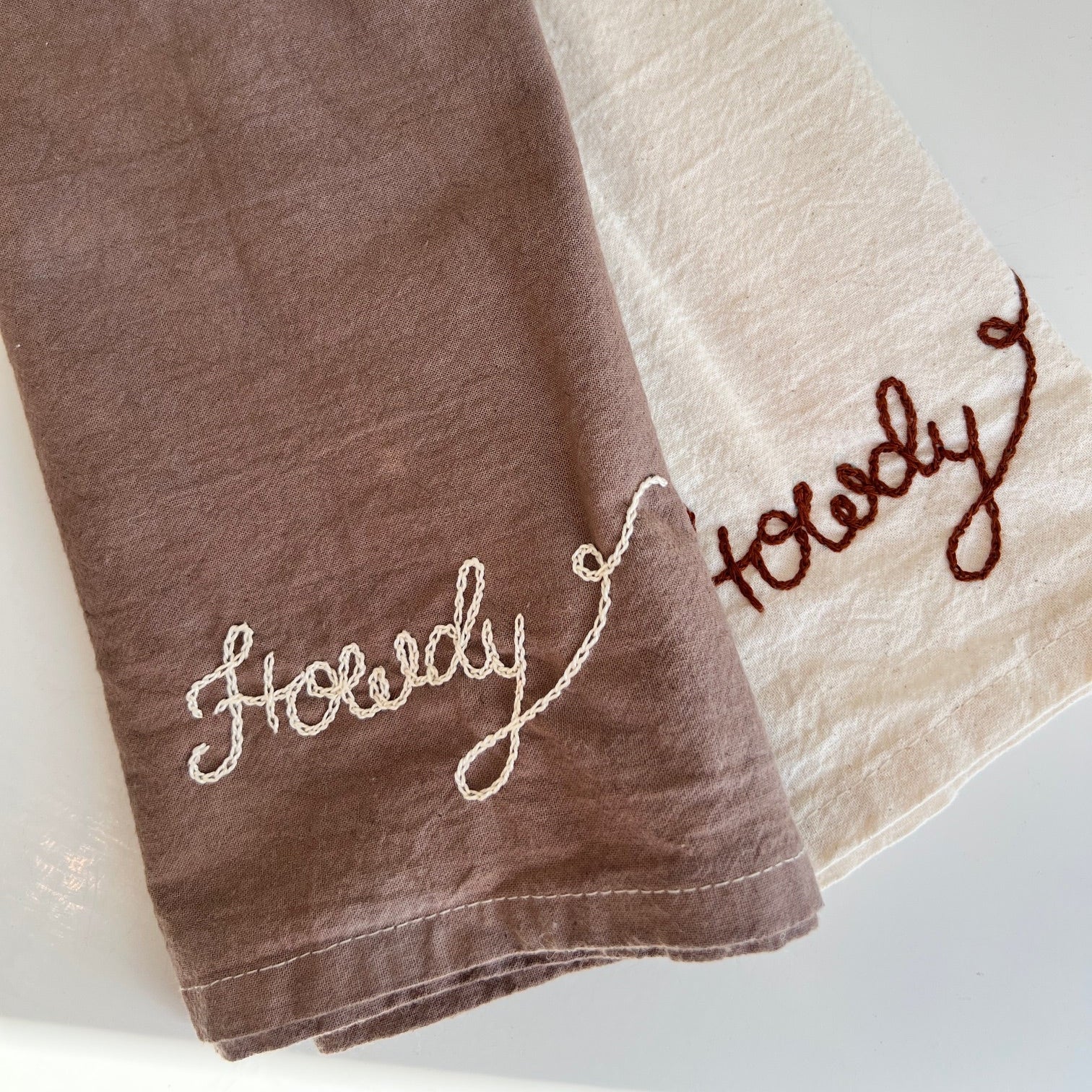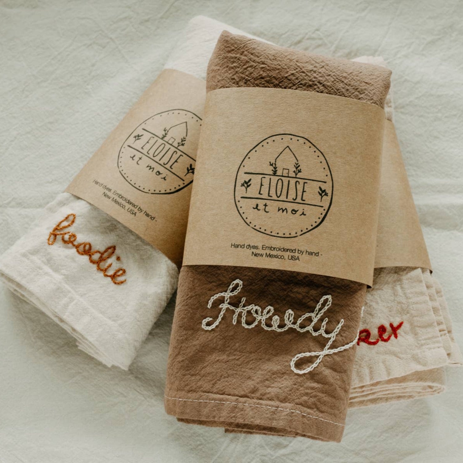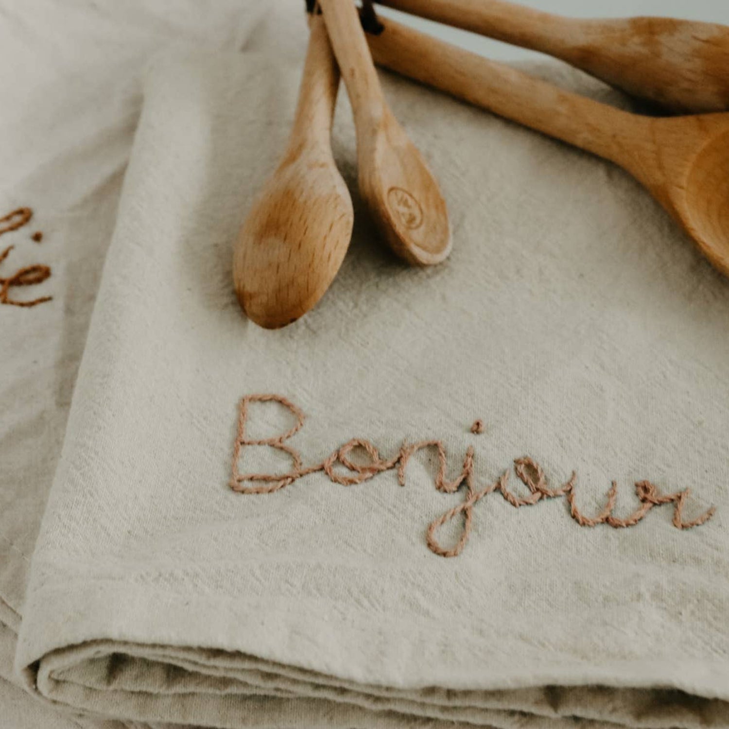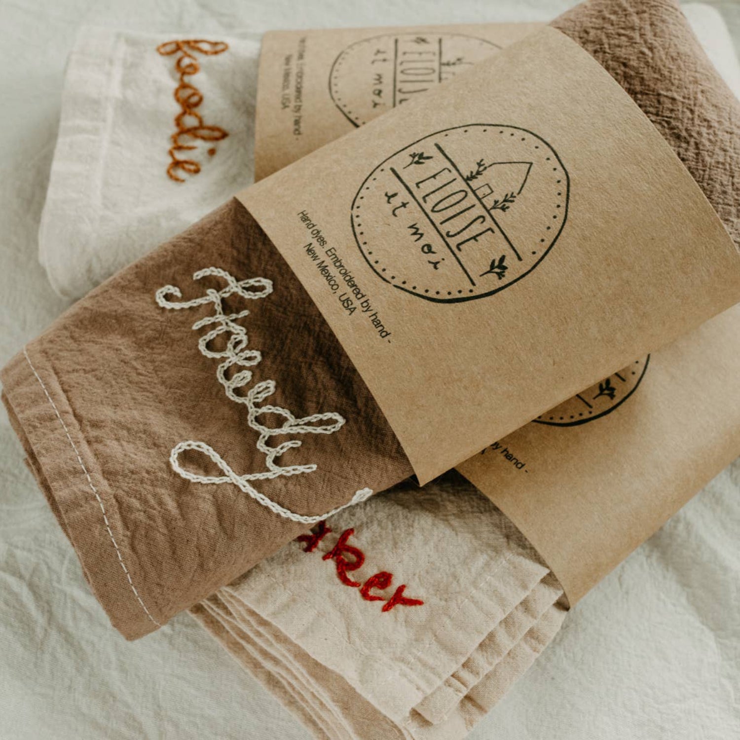 Bring warmth to your home with these certified organic cotton kitchen towels. Each towel is individually hand-embroidered with playful words, making them truly one-of-a-kind.