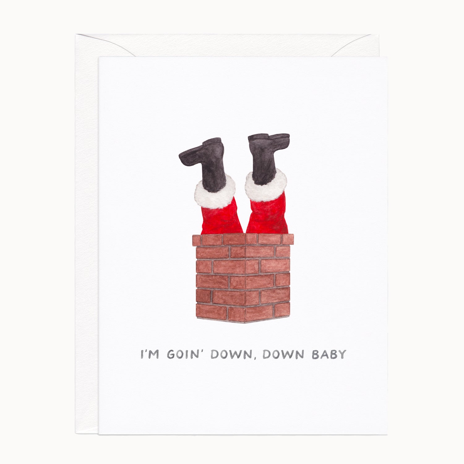 Celebrate the season with this holiday card that features a whimsical watercolor of Santa going down a chimney.