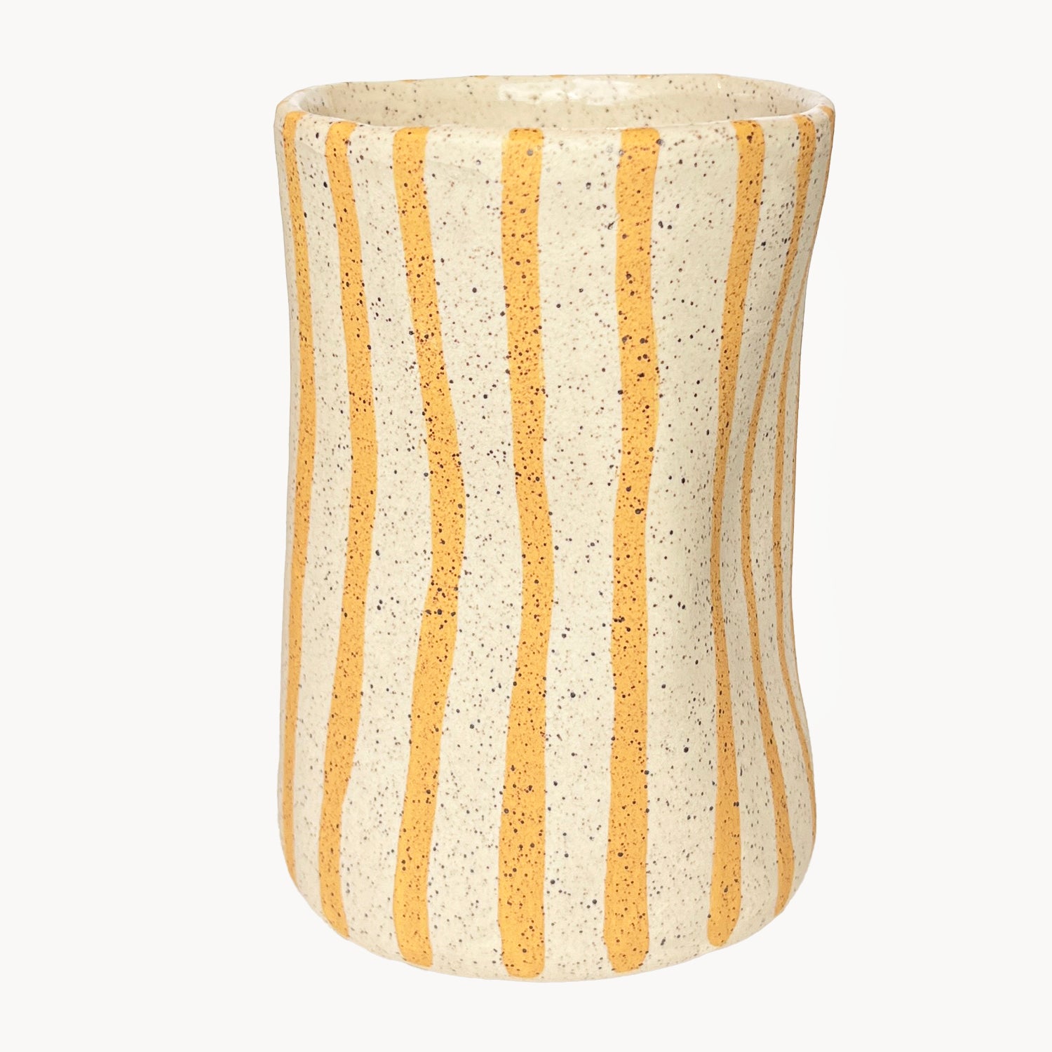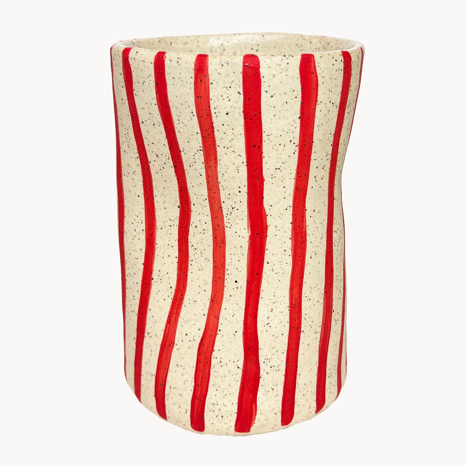 Handmade ceramic vase featuring a colorful hand-painted striped design and squished to make a fun form.