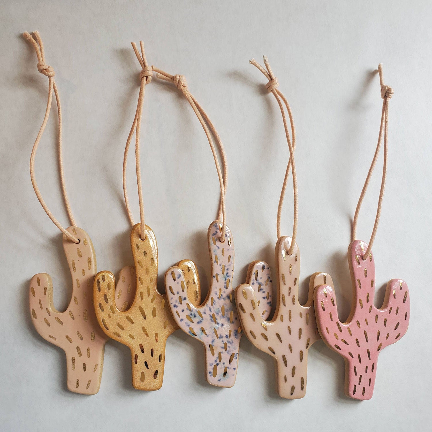 The pink cactus ornament with 22k gold luster spikes the perfect addition to your Christmas tree.