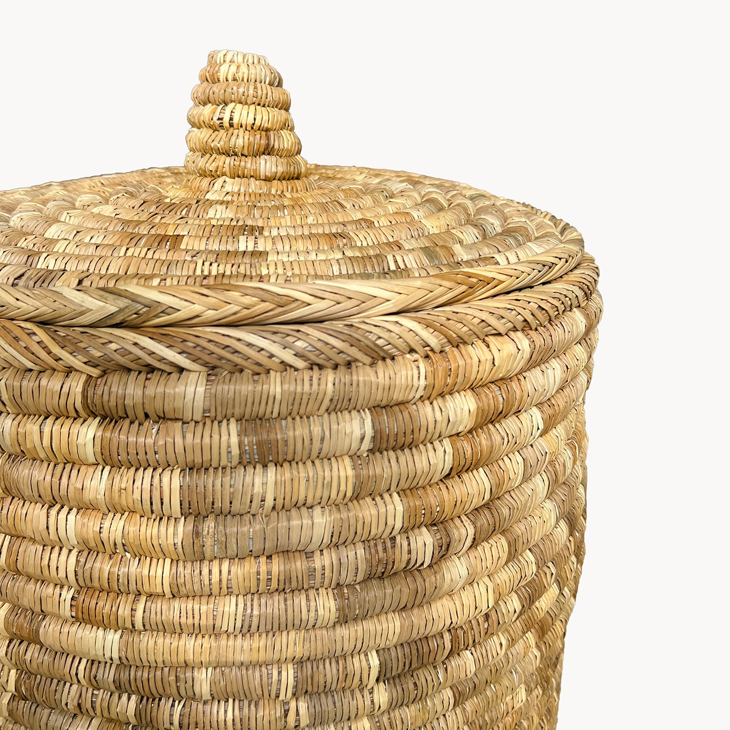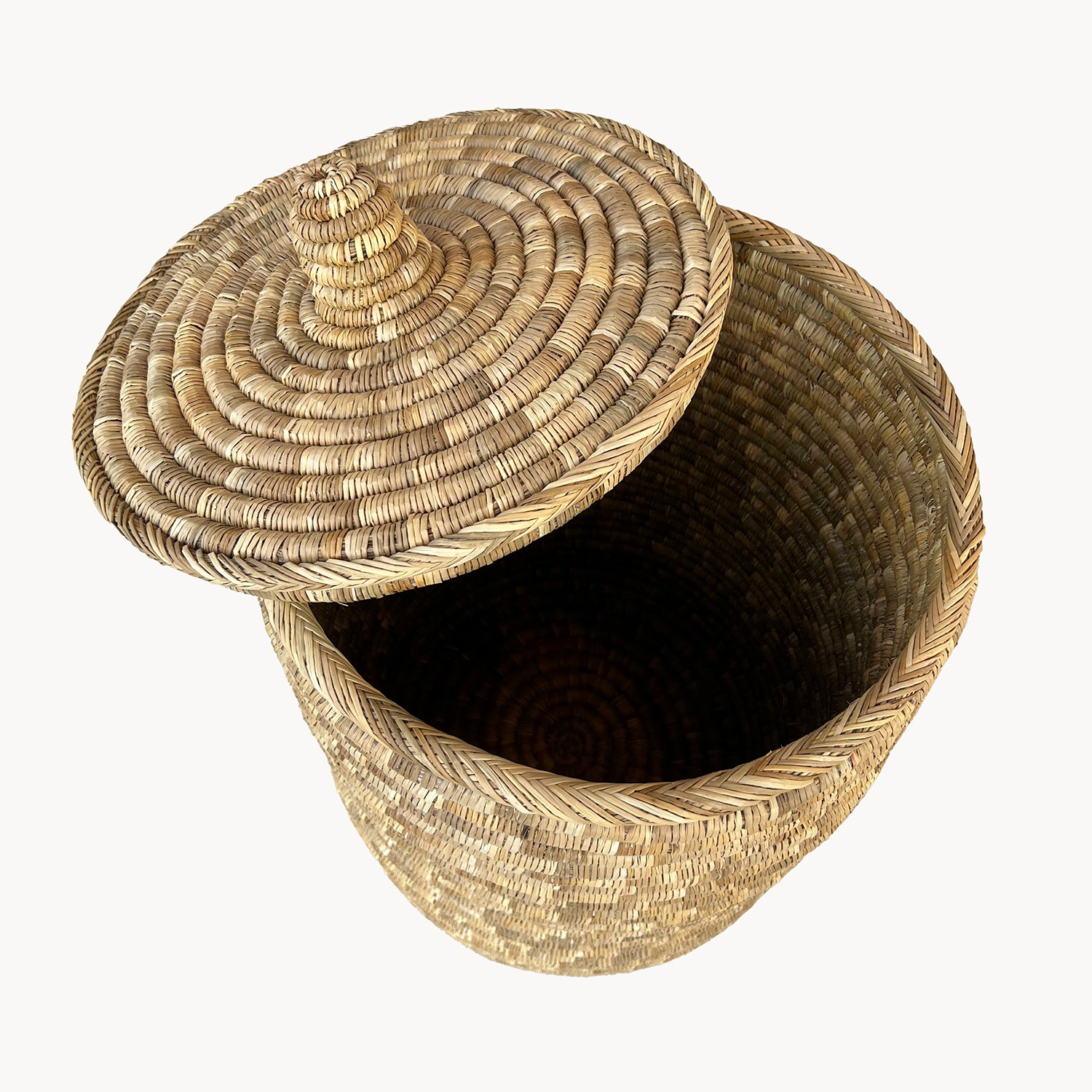 This palm leaf storage basket is handmade from durable & sustainable dried natural fibers. The functional design and neutral color make this basket the perfect storage solution for your home.