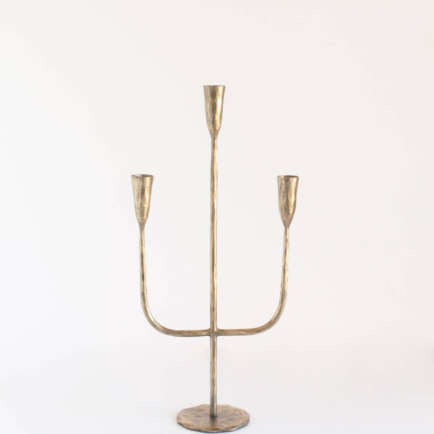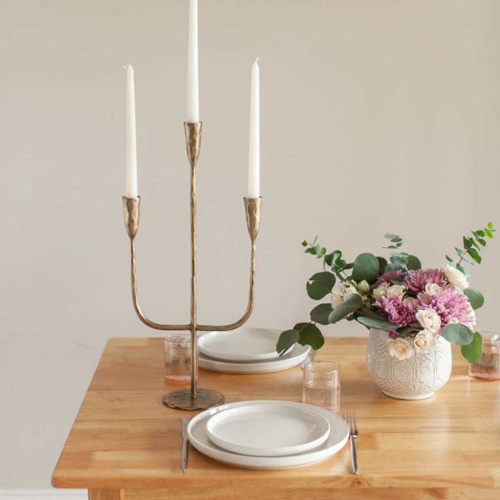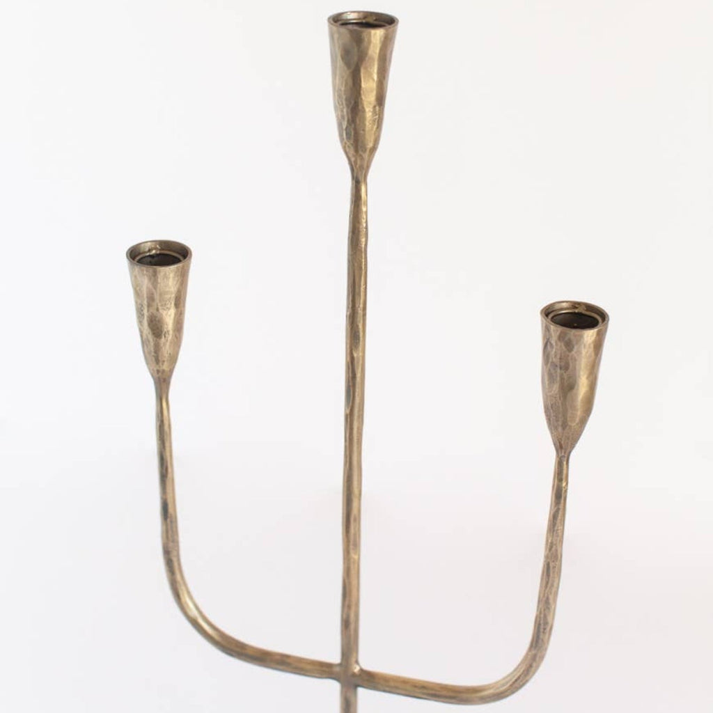 Hand-forged by master blacksmiths in India, this candelabra represent generations of skill united with timeless modern style. Unlike mass-produced alternatives that are cast, these candelabras have a weight and finish that is distinctly premium. With a sturdy weighted base, each is topple tested to ensure safety in addition to elegance.