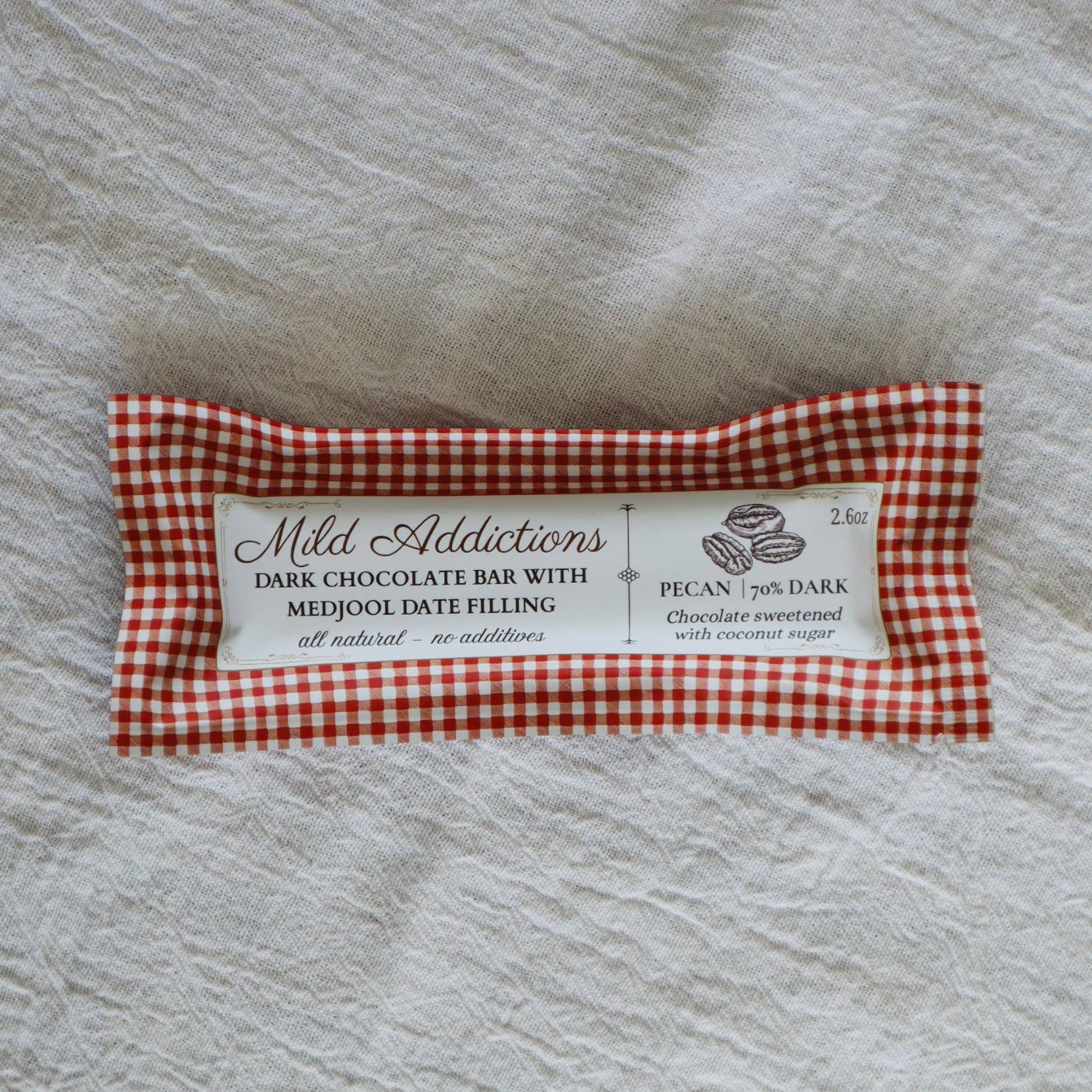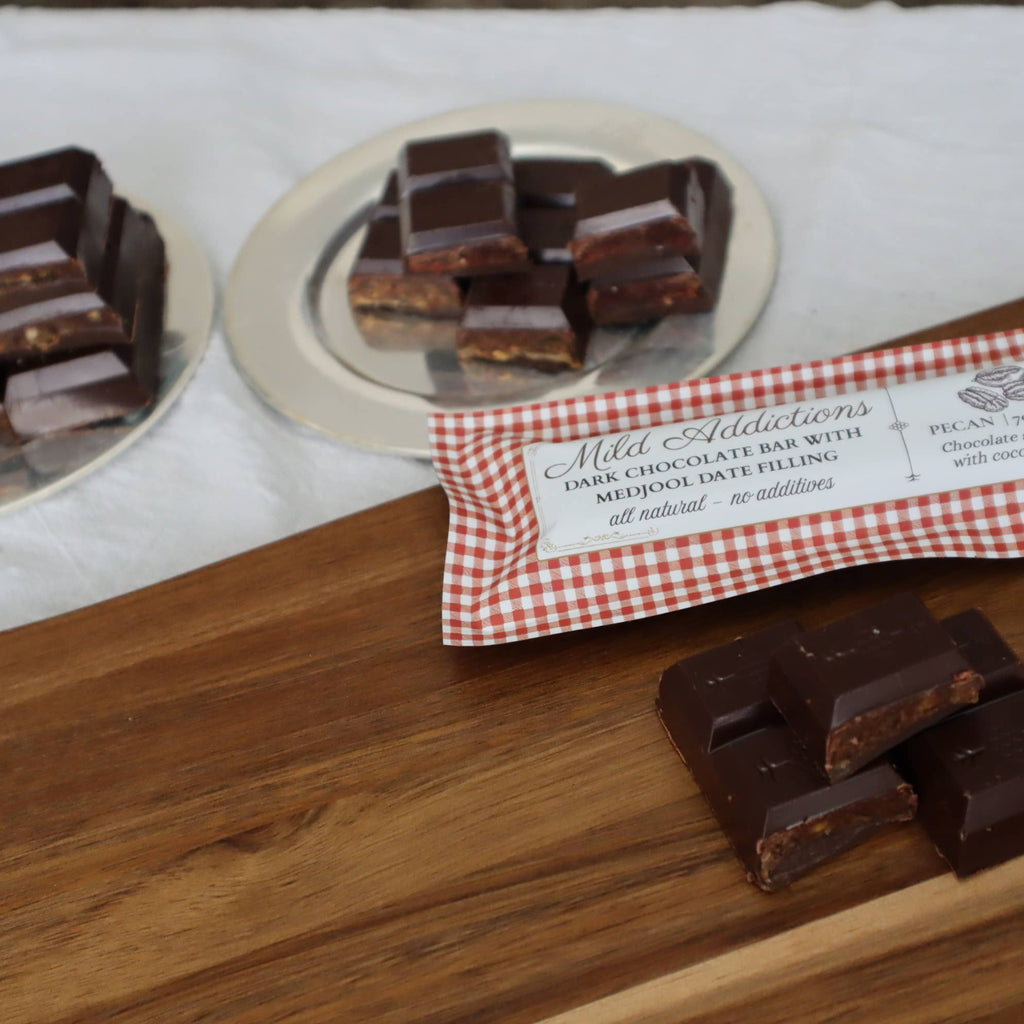 Enjoy the rich, velvety center, expertly crafted with pecans and lenticular dates, delivering the flavor you desire, without any refined sugar or artificial ingredients. Enveloped in silky dark chocolate, it's a juicy bite with a rich, satisfying finish.
