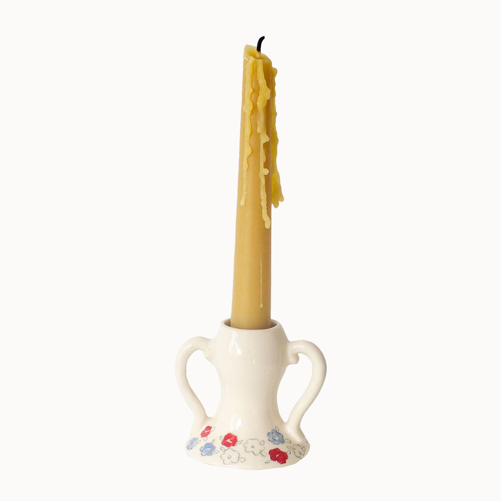 - This candlestick holder is made to fit a variety of taper candlestick sizes- slim taper candles can rest at the base, while larger candles can be secured with some melted wax.