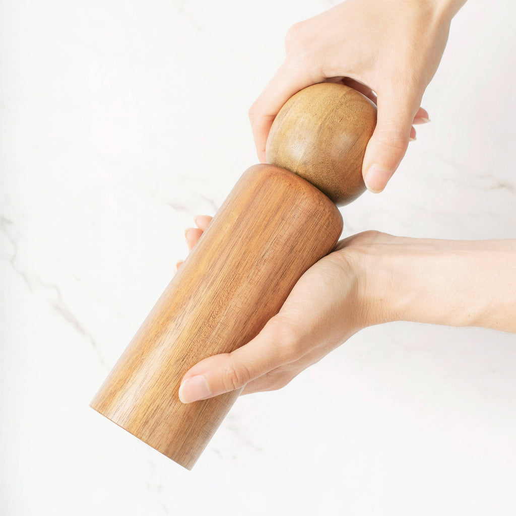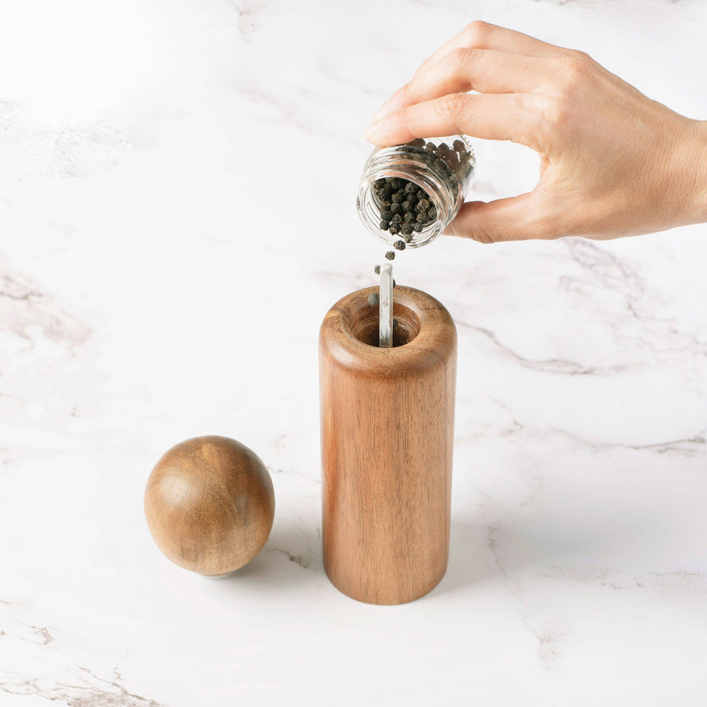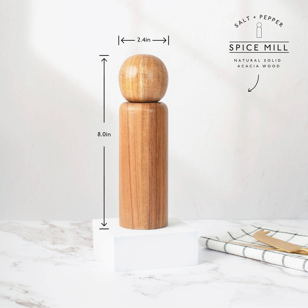 Specifications: Material 100% acacia wood, capacity: 2oz (60ml), size: H8 x D2.4 inches (H20 x D6 cm), mechanism: carbon steel rotor. *Salt and Pepper are NOT included *