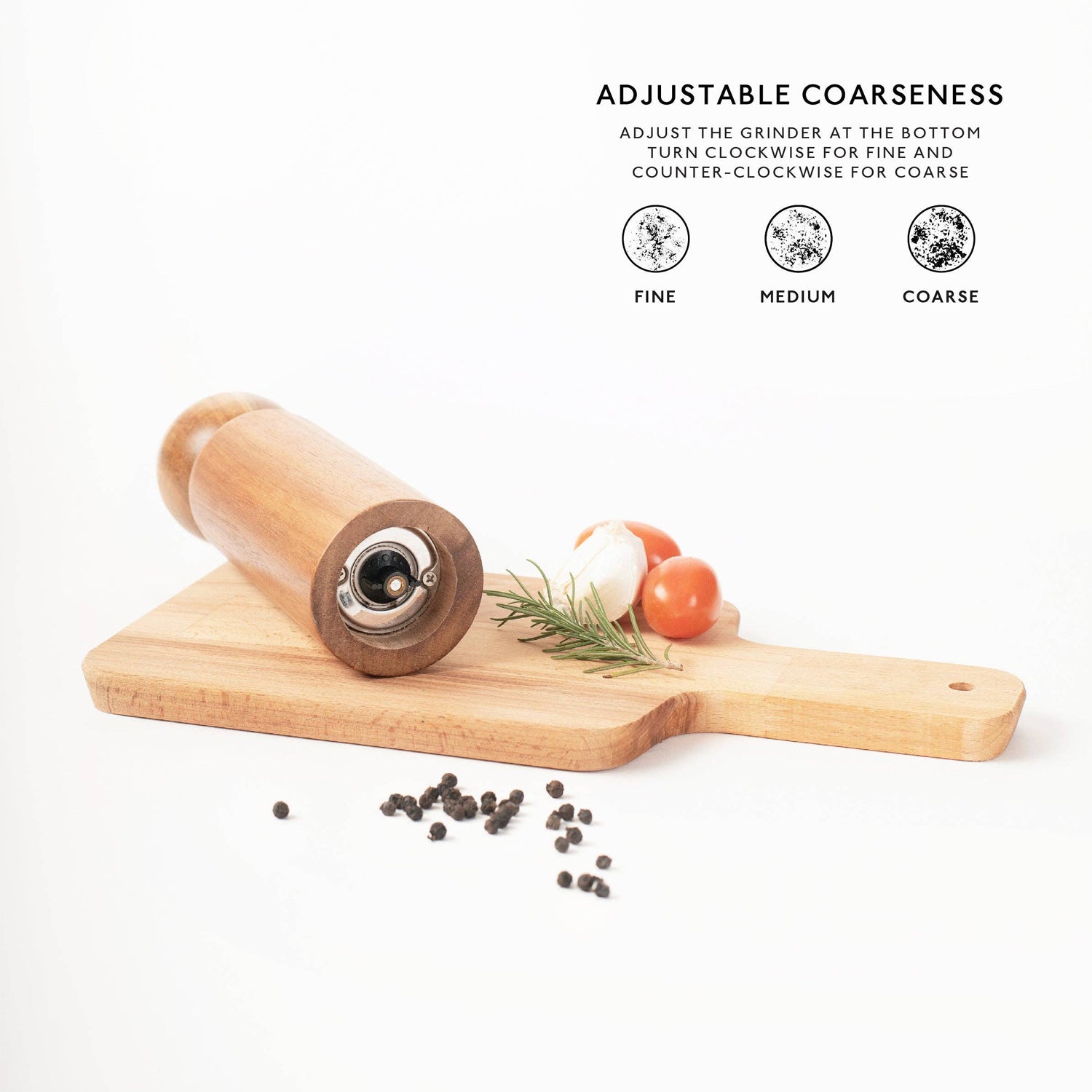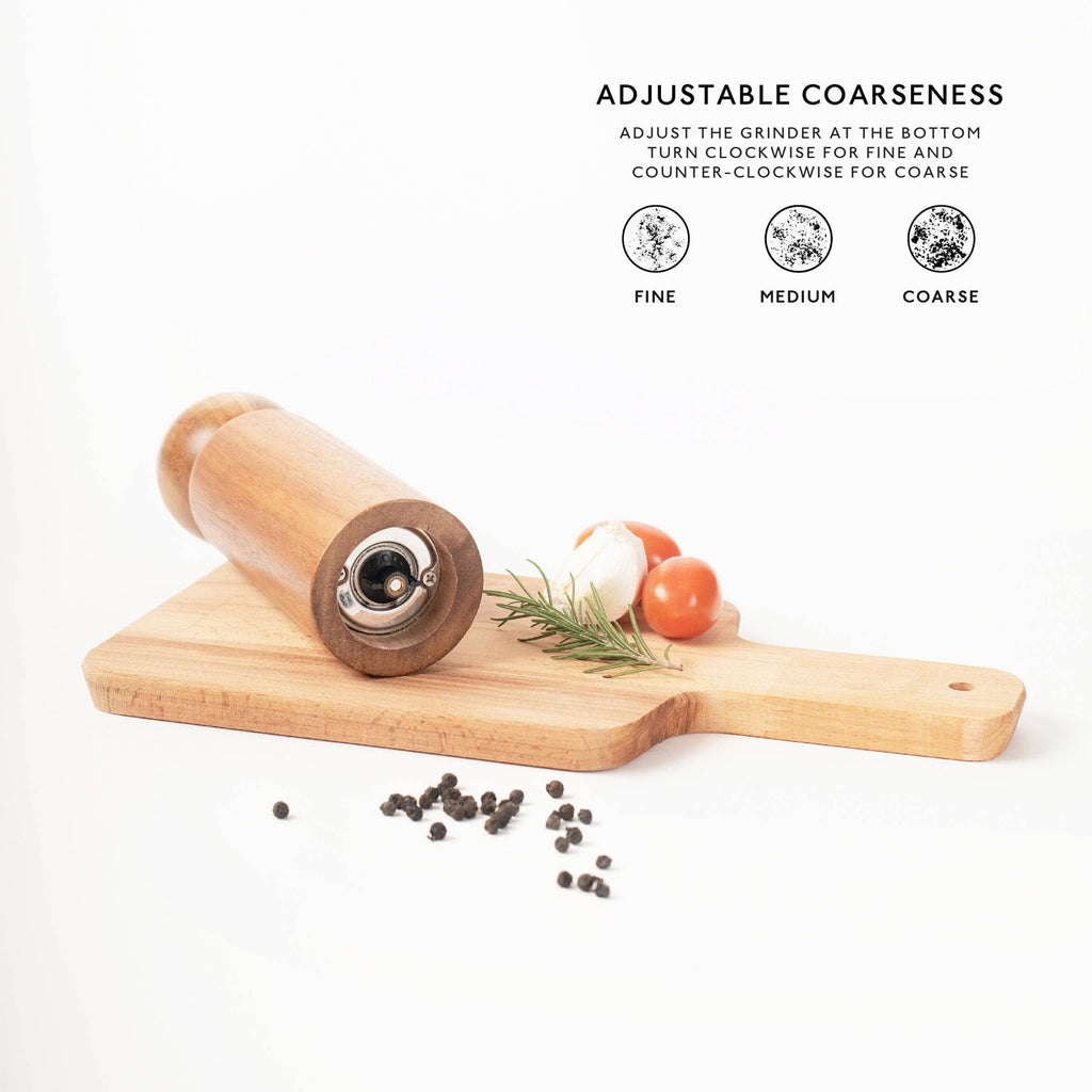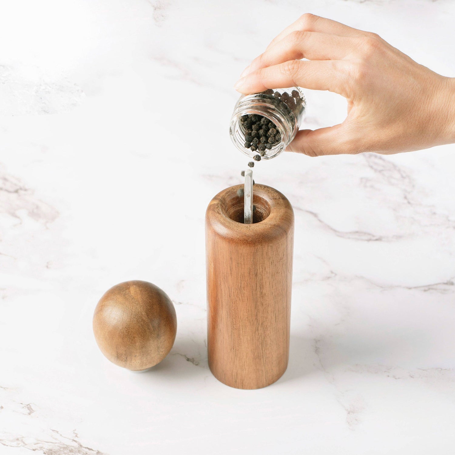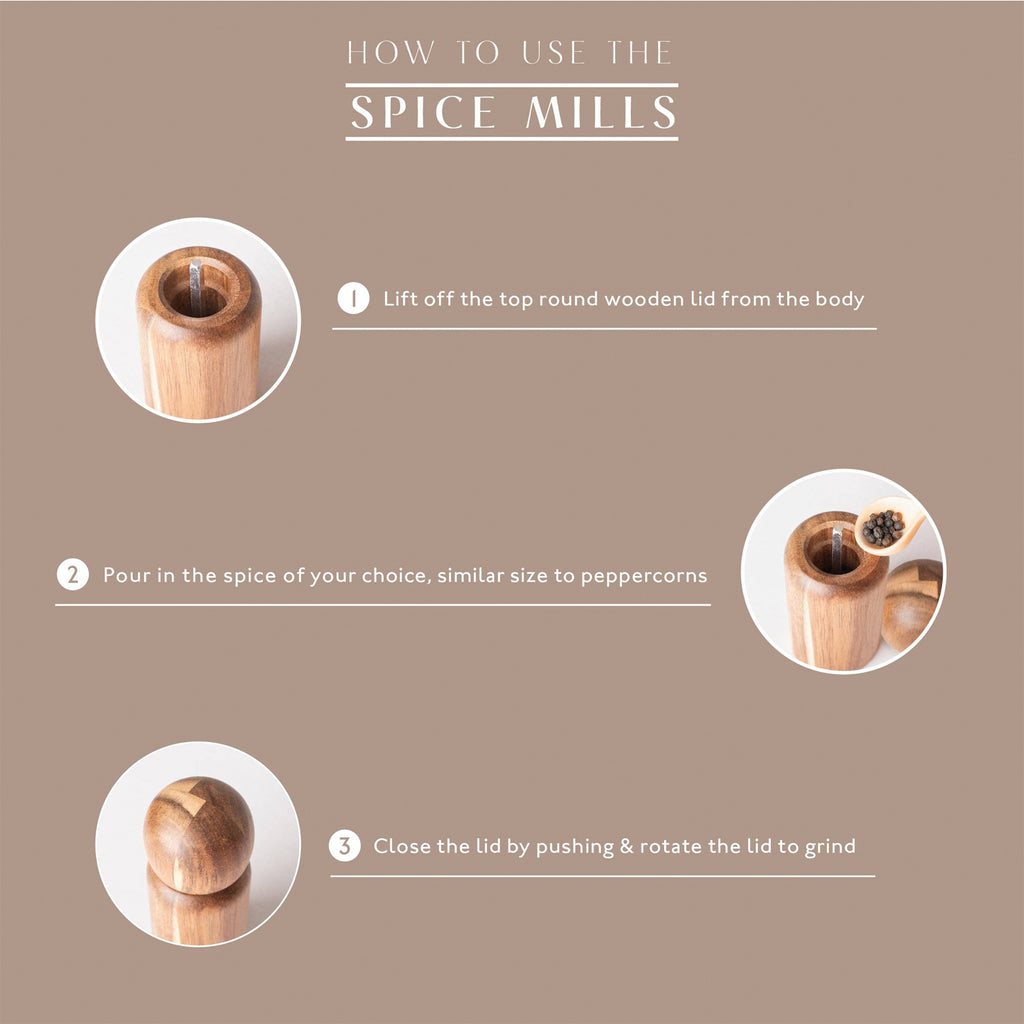 How to Use: Lift off the round wooden lid, pour in any spice of your choice, adjust the grinder at the bottom of the mill (turn clockwise for fine and counter-clockwise for coarse) and rotate the round lid to grind and enjoy!