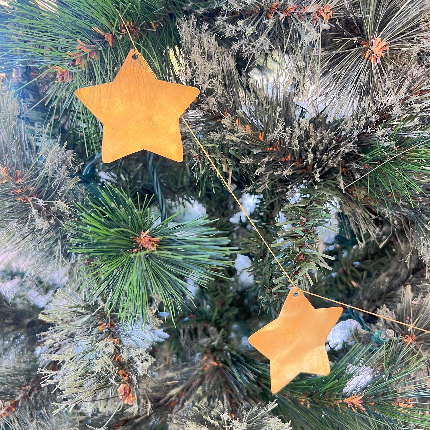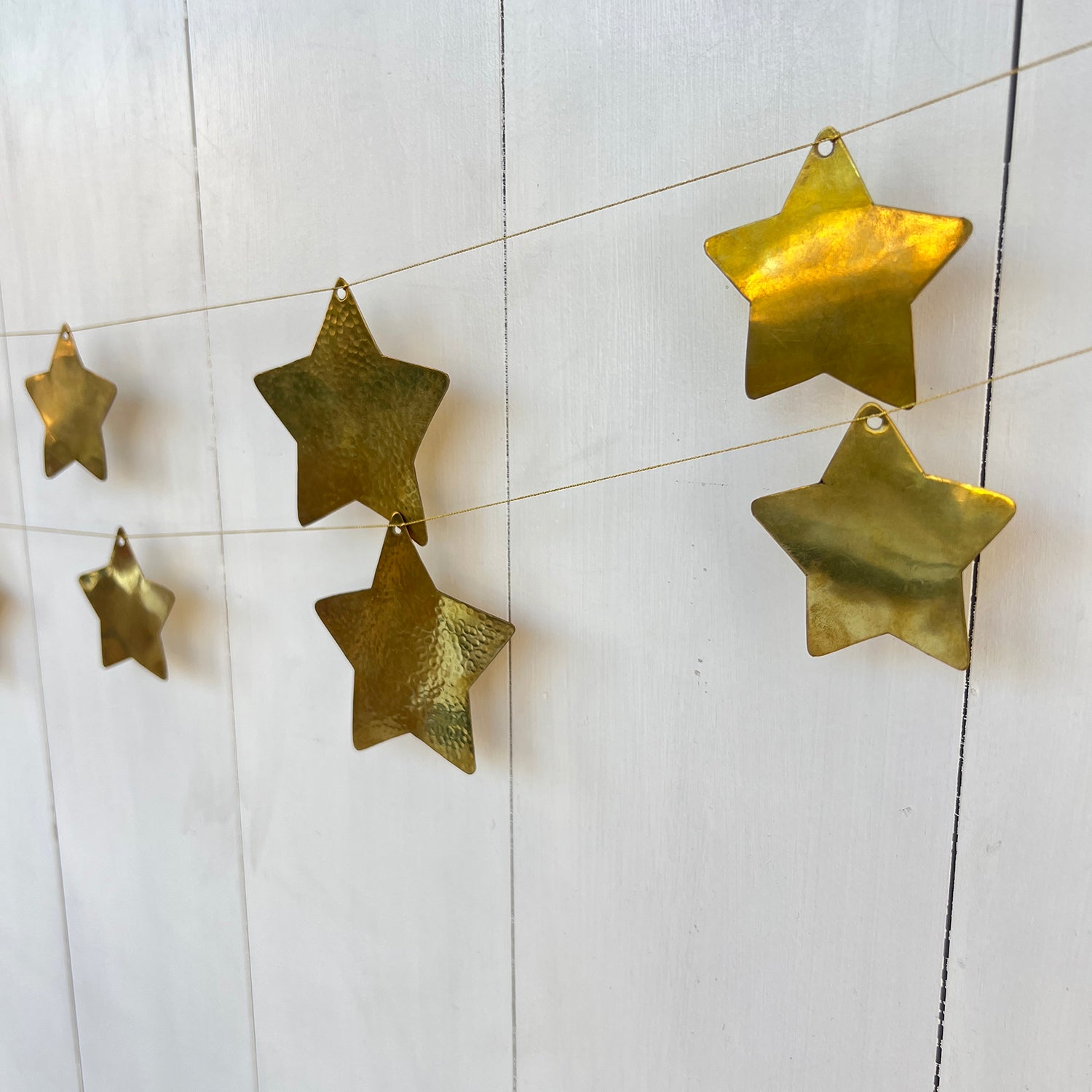This handcrafted garland, made from hand-cut/hammered brass on gold string, makes a great gift and looks stunning with any style of holiday decor. It looks beautiful draped across a mantle or doorway and can also be hung vertically as wall decor.