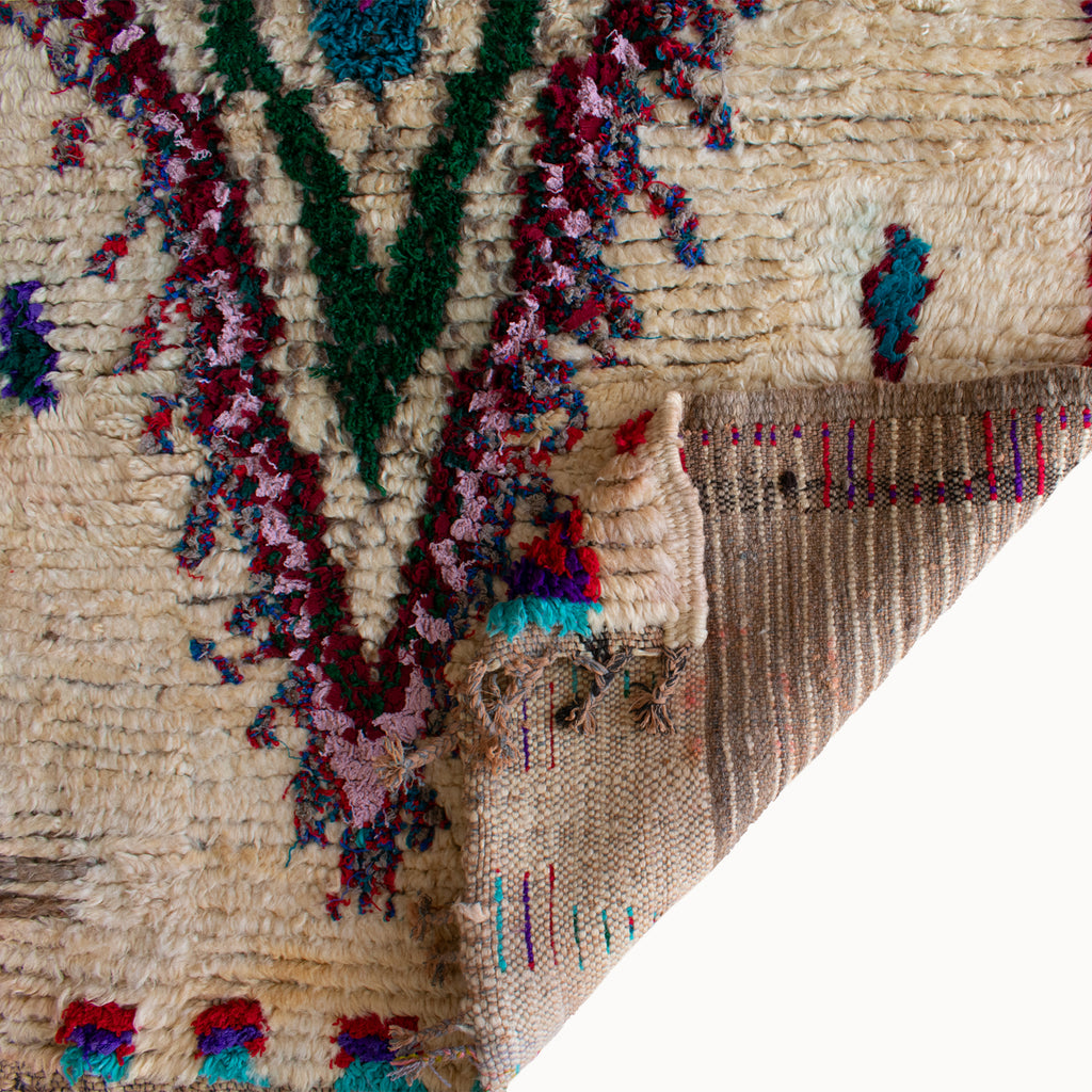 - Hand-knotted in the Atlas Mountains of Morocco using traditional Amazigh weaving techniques.