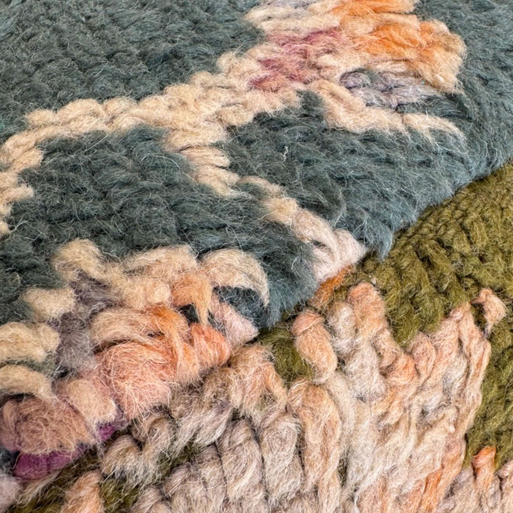A soft pouf handcrafted out of a vintage Moroccan rug. These can be used as a comfortable seat or a cozy place for your pet to lay.